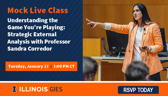 Jan27 Mock Live Class: Understanding the Game You’re Playing: Strategic External Analysis with Professor Sandra Corredor 1:00 PM - 2:00 PM CST Virtual SEE DETAILS